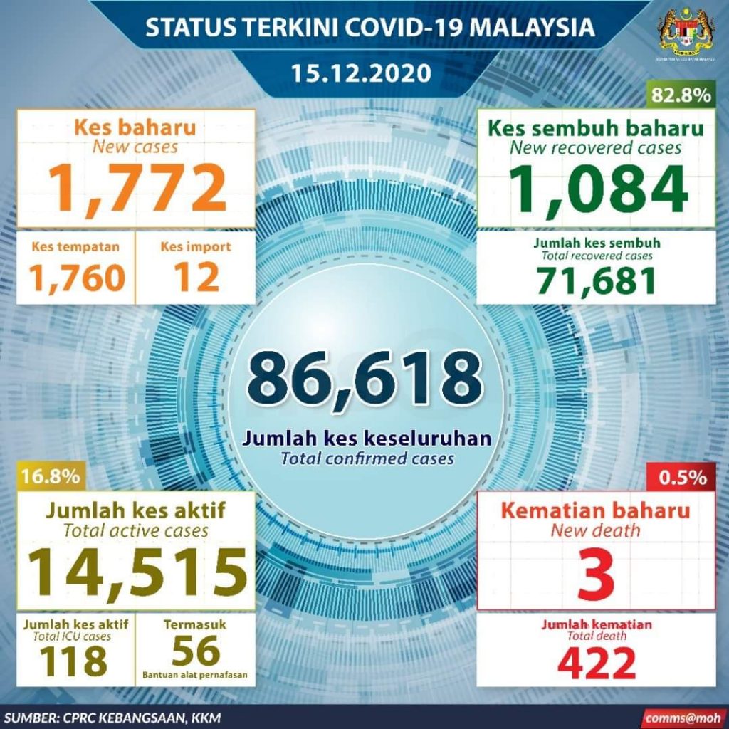 आज डिसेम्बर १५ तारिख,आज मंगलबारको दिन कोरोनाको कारण थप ३ जना नागरिकको मृत्यु भएकोले बढेर जम्मा मृत्यु हुनेको संख्या ४२२ जना पुगेको हो। आजमात्रै पुनः १,७७२ जना नयाँ संक्रमित फ़ेला परेको मलेसियन स्वास्थ्य मन्त्रालयको तथ्यांकमा उल्लेख गरिएको छ। जम्मा संक्रमित मध्य आज १,०८४ जना निको भएसंगै जम्मा ७१ हजार ६८१ जनाले उपचार सकिएर स्वास्थ्य लाभ लिई निको भैइसकेको मन्त्रालयको तथ्यांकले देखाउछ।