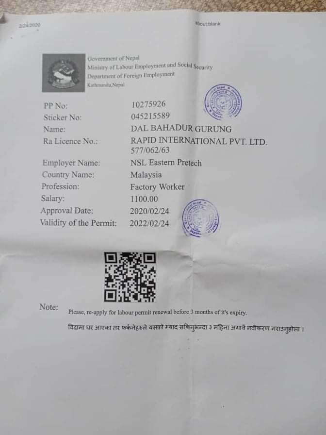 क्वालालम्पुर (मलेसिया):= वैदेशिक रोजगारीको क्रममा गएको फेब्रुअरी महिना २६ तारिख २०२० का दिन नेपालदेखि मलेसियामा एनएसएल इस्टर्न प्रिटेच ( NSL Eastern Pretech ) नामक कम्पनीमा काम गर्न आएका एक नेपाली श्रमिक मलेसियामै सम्पर्क बिहिन (बेपत्ता) भएको छ।
