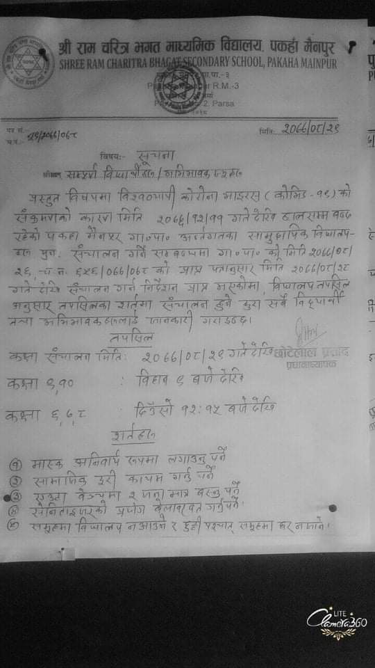 बारा:= पर्साको पकाहा मैनपुर गाउँपालिकामा रहेको श्रीराम चरित्र भगत माध्यामिक विद्यालय कोरोना सम्बन्धिको स्वास्थ्य सुरक्षा नअपनाई विद्यालय सञ्चालनमा आएको भेटिएको छ । कोरोना संक्रमणको कारण बन्द गरीएका विद्यालयहरु स्वास्थ्य सुरक्षा अपनाएर मात्र सञ्चाल गर्ने शर्तमा विद्यालयहरु खोल्न जिल्ला प्रशासन कार्यालय पर्साले अनुमति दिएको थियो ।तर जिल्ला प्रशासन कार्यालय को नियमको खिल्ली उडाउँदै विद्यालय सञ्चालनमा आएको छ।