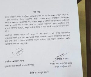 सहमतिको पूर्व विवरण भोलि सार्वजनिक गरिनेछ । भोलि दिउँसो २ बजे सहमतिका विषयहरु सार्वजनिक गर्नको लागि एक समारोह आयोजना गरिनेछ । भोलि यो समारोहमा प्रधानमन्त्रीको साथमा नेत्रविक्रम चन्द विप्लव स्वयं सार्वजनिक हुनेछन् ।