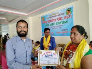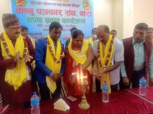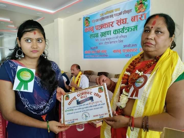 सो अवसरमा कानु पत्रकार संघ बारामा आवद्ध सम्पुर्ण पदाधिकारीहरुलाई प्रमुख अतिथी तारा देबि कानुले सपथ ग्रहण गराउनु भएको थियो । त्यसैगरी कानु पत्रकार संघ बाराको अध्यक्ष अजय साहले प्रमुख अतिथि तारा देबि कानुलाई गणिनाथ महराज अंकित मायाको चिनो प्रदान गर्नु भएको थियो ।