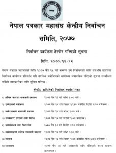 सूचनामा नेपाल पत्रकार महासंघको मिति २०७७ चैत २५ गते सम्पन्न हुने निर्वाचनको लािग यसअघि प्रकाशित निर्वाचन कार्यक्रम परिवर्तन गरी अन्तिम मतदाता नामावली प्रकाशन चैत्र १३ गते साँझ ५ बजेसम्म तोकेको छ ।