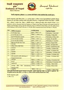 कुवेतस्थित नेपाली दूतावास २०७८ सालमा १८ दिन बन्द हुने।