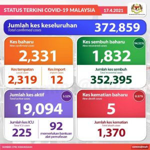 आज मात्रै पुनः २,३३१ जना नयाँ संक्रमित फ़ेला परेको मलेसियन स्वास्थ्य मन्त्रालयको तथ्यांकमा उल्लेख गरिएको छ। जम्मा संक्रमित मध्य आज १,८३२ जना निको भएसंगै जम्मा ३ लाख ५२ हजार ३९५ जनाले उपचार सकिएर स्वास्थ्य लाभ लिई निको भैइसकेको मन्त्रालयको तथ्यांकले देखाउछ।