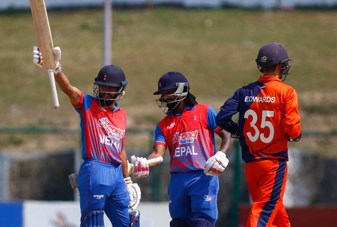 काठमाडौं := ओपनर कुशल भुर्तेल र दीपेन्द्र सिंह ऐरीले अर्धशतक बनाएपछि नेपालले त्रिकोणात्मक टी–२० सिरिजमा नेदरल्याण्ड्सलाई २०७ रनको लक्ष्य दिएको छ । कीर्तिपुरस्थित त्रिवि अन्तर्राष्ट्रिय मैदानमा टस जितेर पहिले ब्याटिङ गरेको नेपालले निर्धारित २० ओभरमा ६ विकेट गुमाएर २०६ रन बनाएको हो ।