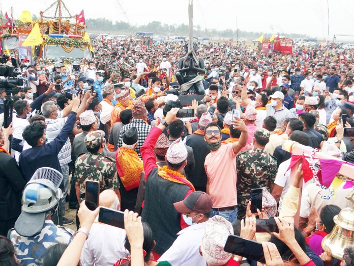 निर्वाचनका र्याली र कुम्भ मेलाले भारतमा महामारी फैलाएको समाचार विश्वभर प्रसारित हुँदा पनि मूर्ति प्रतिस्थापन गर्न गत बुधबार पर्यटनमन्त्री भानुभक्त ढकाल र बागमतीका मुख्यमन्त्री डोरमणि पौडेलको नेतृत्वमा चितवनको माडीमा चार हजार मान्छेको भिड जम्मा भयो ।