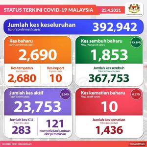 आज मात्रै पुनः २,६९० जना नयाँ संक्रमित फ़ेला परेको मलेसियन स्वास्थ्य मन्त्रालयको तथ्यांकमा उल्लेख गरिएको छ। जम्मा संक्रमित मध्य आज १,८५३ जना निको भएसंगै जम्मा ३ लाख ६७ हजार ७५३ जनाले उपचार सकिएर स्वास्थ्य लाभ लिई निको भैइसकेको मन्त्रालयको तथ्यांकले देखाउछ।