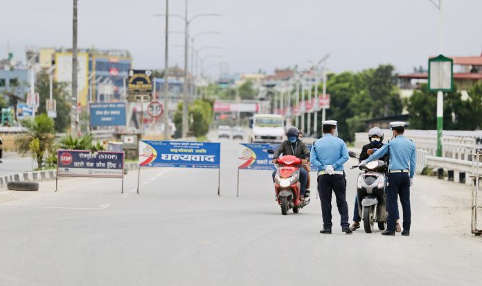 निषेधाज्ञा जारी भएको पहिलो दिन काठमाण्डौको सडक, प्रहरी चेकिङ र होल्डिङमा राखिएका सवारीहरु । तस्वीरः नवराज श्रेष्ठ