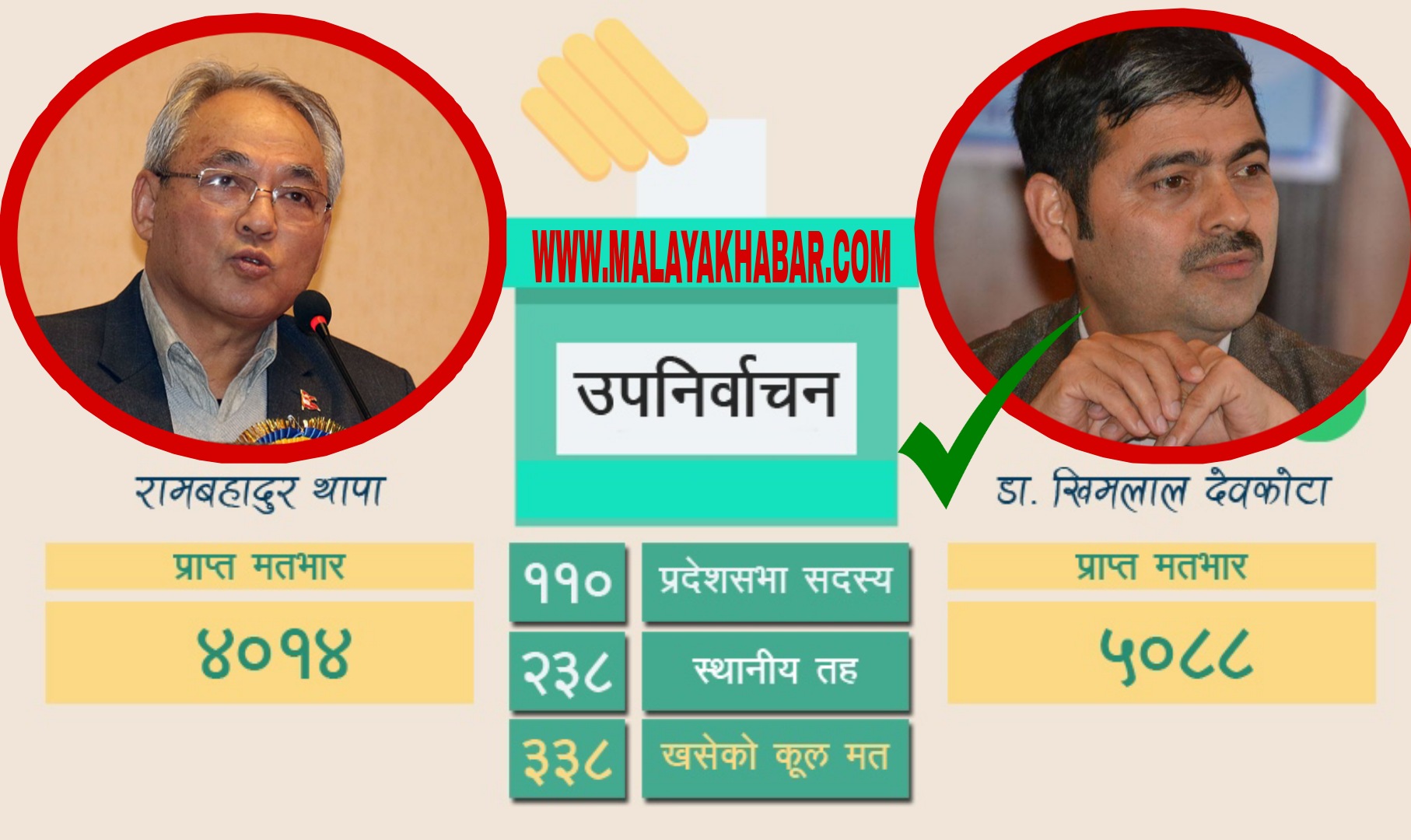 हेटौंडा:= बागमती प्रदेशमा रिक्त रहेको राष्ट्रिय सभा सदस्य पदको उपनिर्वाचनबाट स्वतन्त्र उम्मेदवार डा. खिमलाल देवकोटा निर्वाचित हुनुभएको छ । एमालेको तर्फबाट उम्मेदवार बन्नुभएका गृहमन्त्री समेत रहनु भएको रामबहादुर थापा बादललाई ३५ मत मतान्तरले देवकोटा विजयी हुनुभएको हो । बादलले मत १४८ मत प्राप्त गर्दा देवकोटाले भने १८३ मत प्राप्त गर्नुभएको थियो ।