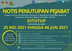 जारी एमसिओ र कोरोना माहामारीलाई ध्यानमा राखेर मलेसिया सेलाङ्गर स्थित अध्यागमन बिभाग (इमिग्रेशन) को कार्यालय,काउन्टर शाखाहरु आज मेय २५ तारिखदेखि बन्द भएको छ।