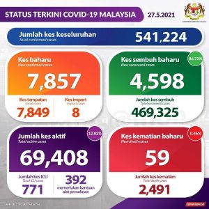 आज मात्रै पुनः ७,८५७ जना नयाँ संक्रमित फ़ेला परेको मलेसियन स्वास्थ्य मन्त्रालयको तथ्यांकमा उल्लेख गरिएको छ। जम्मा संक्रमित मध्य आज ४,५९८ जना निको भएसंगै जम्मा ४ लाख ६९ हजार ३२५ जनाले उपचार सकिएर स्वास्थ्य लाभ लिई निको भैइसकेको मन्त्रालयको तथ्यांकले देखाउछ।