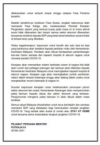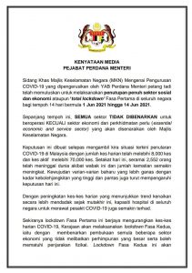 आज मे २८ तारिख शुक्रबारको दिन मलेसियाको प्रधानमन्त्री तान श्री मुहिद्दीन यासीनको अध्यक्षतामा बसेको मन्त्री परिषदको बैठकले जुन महिनाको १ तारिखदेखि १४ तारिखसम्म लागू हुनेगरी १४ दिन सम्मको लागि अतिआवश्यक आर्थिक र सेवा क्षेत्र बाहेक सम्पुर्ण कामकाज देशैभर बन्द गरेर पुर्ण रुपमा देशव्यापी लकडाउन गर्ने निर्णय गरेको हो।
