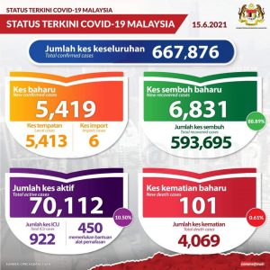 आज मात्रै पुनः ५,४१९ जना नयाँ संक्रमित फ़ेला परेको मलेसियन स्वास्थ्य मन्त्रालयको तथ्यांकमा उल्लेख गरिएको छ। जम्मा संक्रमित मध्य आज ६८३१ जना निको भएसंगै जम्मा ५ लाख ९३ हजार ६९५ जनाले उपचार सकिएर स्वास्थ्य लाभ लिई निको भैइसकेको मन्त्रालयको तथ्यांकले देखाउछ।