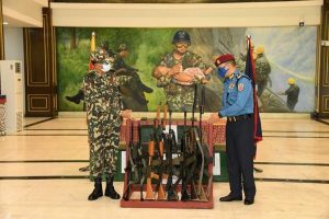 काठमाडौं:= प्रधान सेनापति महारथी पूर्णचन्द्र थापाले प्रहरी महानिरीक्षक शैलेश थापा क्षेत्रीलाई जंगी अड्डामा सोमबार आयोजित एक कार्यक्रमकाबीच विभिन्न किसिमका ३ सय नाल हतियार तथा सोको ४२ हजार ३ सय ७० गोटा एम्युनिशन र सम्बद्ध सामग्रीहरु हस्तान्तरण गर्नुभएको छ।