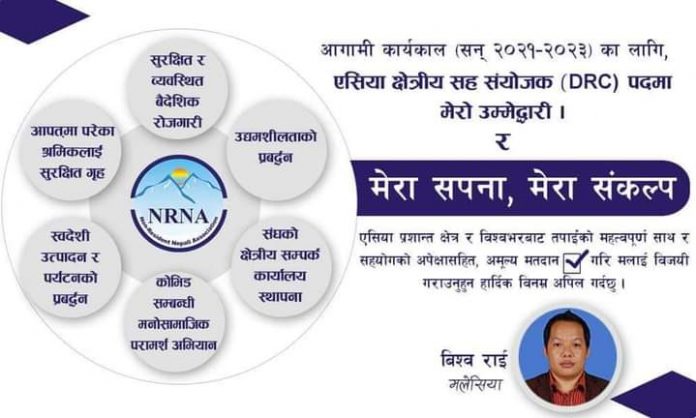 गैर आवासीय नेपाली संघको आगामी अक्टोबर २३ देखि काठमाडौंमा सम्पन्न हुने केन्द्रीय महाधिवेशनमा एसिया सह–संयोजक DRC पदमा विश्व राई ले उम्मेद्वारी घोषणा गर्नुभएको छ ।