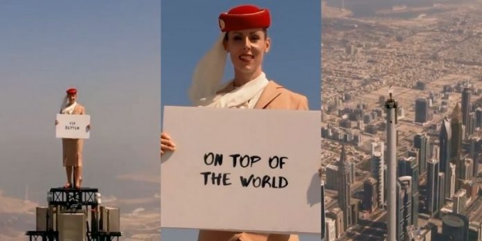 एजेन्सी := संयुक्त अरब इमिरेट्सको एयरलाइन्स कम्पनी इमिरेट्स एयरलाइन्स आफ्नो नयाँ विज्ञमपनका कारण चर्चामा छ । एयरलाइन्सको यो विज्ञापन संसार कै सबैभन्दा अग्लो भवन बुर्ज खलिफाको टुप्पोमा खिचिएको छ । कम्पनीले शेयर गरेको भिडियोमा एक महिला एयरलाइन्स क्रु सदस्यको पोसाकमा बुर्ज खलिफाको टुप्पोमा उभिएको देख्न सकिन्छ ।