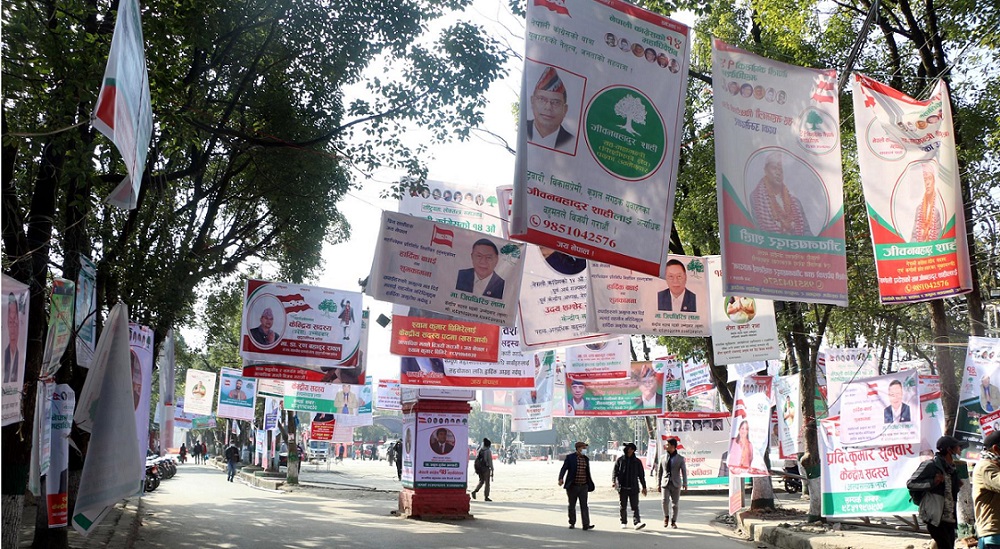 भृकुटीमण्डपको गेटबाटै सुरु हुन्छ, खचाखच ब्यानर । रुख, खाली स्थान, भित्ता कहीँ खाली ठाउँ छैन सबै उम्मेदवारका प्रचार सामग्रीले भरिएका छन् । प्रदर्शनीमार्गको सडकका दुवैतिरका भित्तामा प्रचार सामग्रीले सजिएका छन् । राष्ट्रियसभागृह र महेन्द्र पुलिस क्लब पनि चारतारे झण्डा र प्रचार सामग्रीले रङ्गिएको छ । गेटबाट भित्र झिर्नासाथ चारैतिर ब्यानरले झकिझाउ छ । चारतारे झण्डाले मञ्च सिङ्गारिएको छ । उद्घाटनस्थल मात्रै होइन, बन्दसत्र हुने प्रदर्शनी कक्षभित्र पनि आकर्षकरूपमा सजाइएको छ । भित्रपट्टि पनि छुट्टै मञ्च बनाइएको छ । चार दिनसम्म करिब पाँच हजार कांग्रेसका महाधिवेशन प्रतिनिधिले यो स्थानमा छलफल र बहस गरेर नयाँ नेतृत्व चुन्नेछन् । सोही स्थानभित्र विभिन्न पदाधिकारी र सदस्यका अकांक्षीले सम्पर्क कार्यालय खोलेर प्रतिनिधिलाई आकर्षण गरिरहेका छन् ।