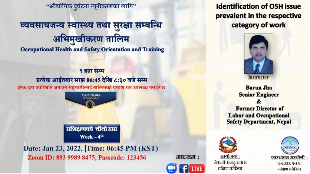 दक्षिण कोरिया := नेपाली राजदुतावास दक्षिण काेरियाले यहि जनवरी २ तारिखदेखि “व्यवसायजन्य स्वास्थ्य तथा सुरक्षा सम्बन्धी अभिमुखिकरण तालिम सञ्चालन गरेको छ । कार्यक्रम हरेक आइतबार काेरियन समय साँझ ७ बजे देखि ८: ३० बजेसम्म हुने जनाएकाे छ।