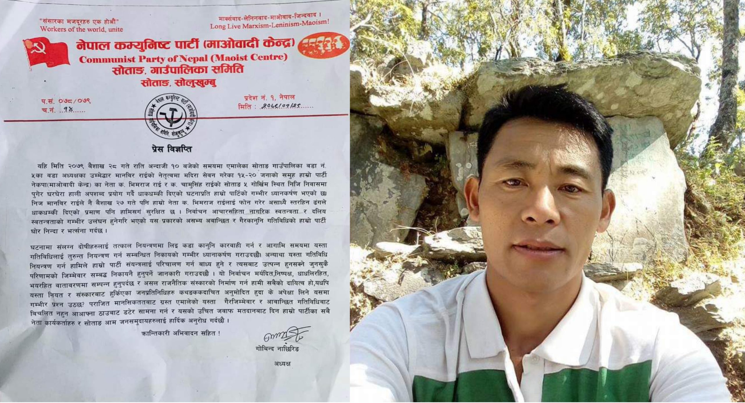 माओवादी केन्द्र सोताङ गाउँपालिकाले एक बिज्ञप्ति जारी गर्दै यो भन्दा अगाडि पनि पटक पटक फोनमा तथानाम गाली गरेको प्रमाण रहेको बताउदै अहिले स्थानीयबासिहरु लाई प्रयोग गरि मदिरा सेवन गराइ घर घेराउ गरेको बताएको छ ।