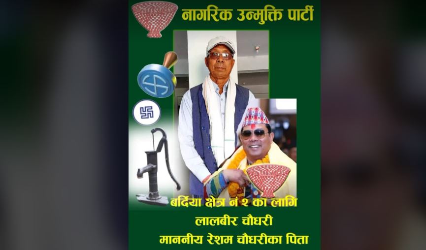 बर्दिया:= नागरिक उन्मुक्ति पार्टीका संरक्षक तथा चर्चित नेता रेशम चौधरीको उम्मेदवारी खारेज भएपछि बर्दिया क्षेत्र नम्बर २ मा उनको बुवा चुनाव लड्ने भएका छन् । रेशमको उम्मेदवारी खारेजपछि सो क्षेत्रमा उनकै पिता लालवीर चौधरीलाई नागरिक उन्मुक्ति पार्टीले व्यवहारिक रुपमा अघि सार्दै समर्थन गर्ने निर्णय समेत गरेकाे छ ।