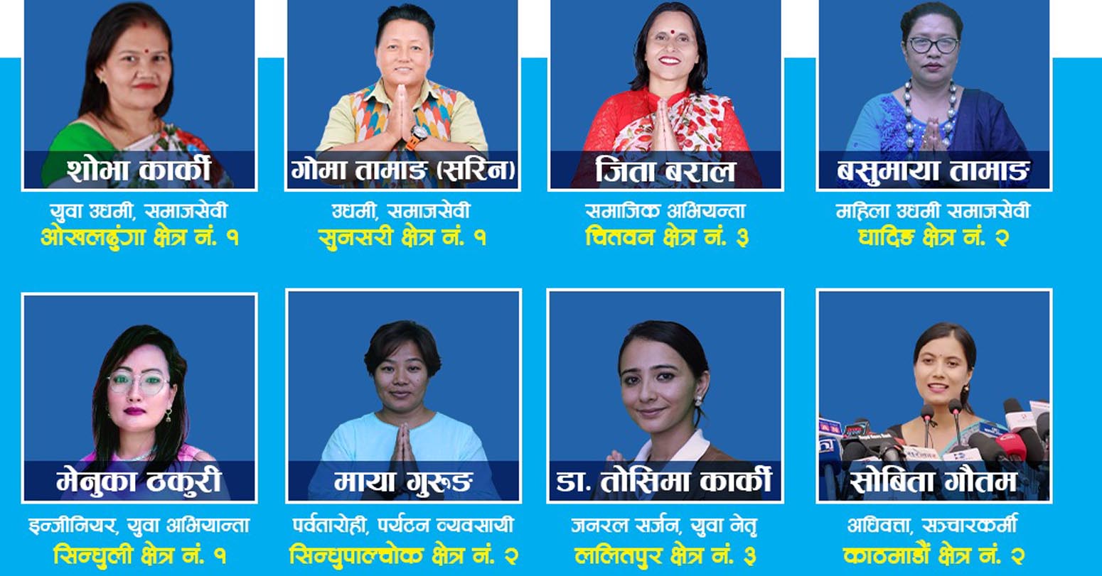 पार्टीले चितवन ३ बाट सामाजिक अभियन्ताको परिचय बनाएकी जिता बराल, सिन्धुली १ बाट इन्जिनियर तथा युवा अभियन्ता मेनुका ठकुरी, महोत्तरी १ बाट पर्यटन व्यवसायी तथा समाजसेवी खेमकुमारी भुर्तेललाई टिकट दिएको छ । त्यस्तै सोही पार्टीको तर्फबाट बाग्लुङ २ बाट सामाजिक अभियन्ता तिला खत्री र रामेछाप १ बाट सामाजिक अभियन्ता समिक्षा श्रेष्ठलाई चुनावमा उतारेको छ ।