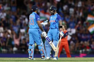 एजेन्सी:= अष्ट्रेलियामा जारी टी–२० विश्वकप क्रिकेटमा भारतले लगातार दोस्रो जित हात पारेको छ। प्रतियोगिताको आफ्नो दोस्रो खेलमा बिहीबार नेदरल्याण्ड्सलाई ५६ रनले हराउँदै भारतले जित दर्ता गरेको हो। सिड्नीमा टस जितेर पहिला ब्याटिङ गरेको भारतले निर्धारित २० ओभरमा २ विकेट गुमाउँदै १७९ रन बनायो । भारतका ३ जना ब्याट्सम्यानले अर्धशतक पूरा गरे ।